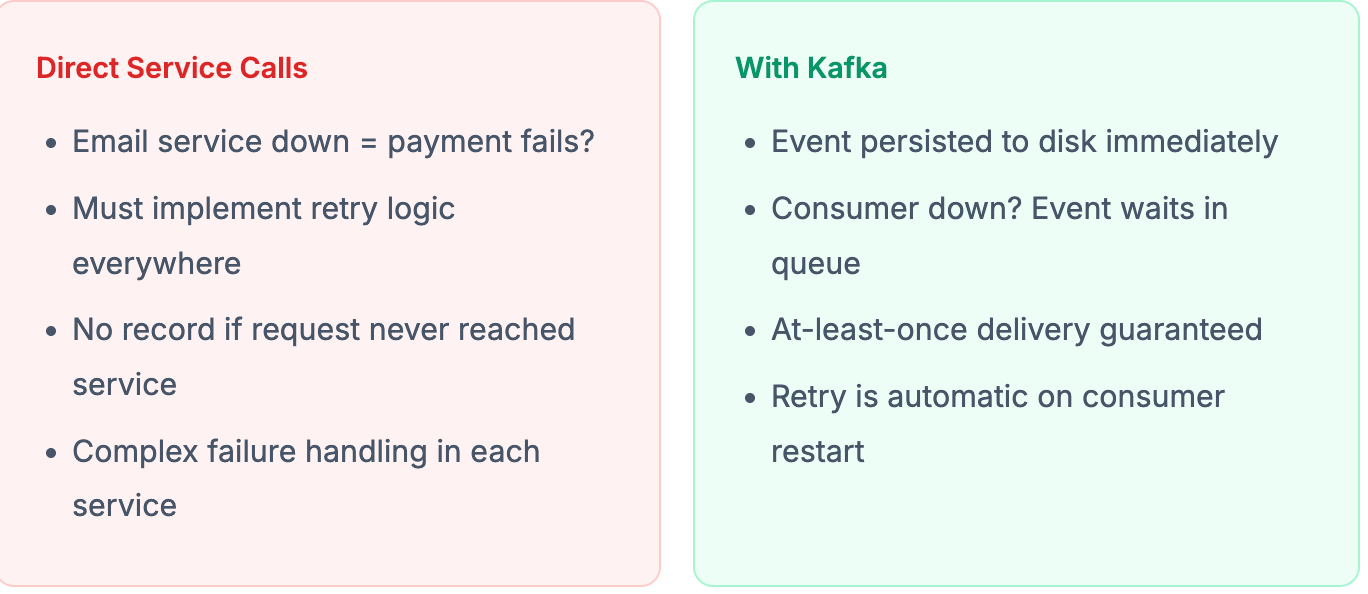 The Payment Scenario: A customer completes a payment. You need to: update their order status, send a confirmation email, notify the warehouse, update analytics, and trigger loyalty points. If any of these downstream services are down at that moment, what happens to the payment event?