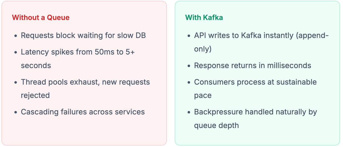 The Async Pattern: Your API pushes a “send welcome email” event to Kafka and immediately returns success to the user. A background worker picks up that event and handles the actual email sending. The user gets instant feedback, and the email arrives moments later.