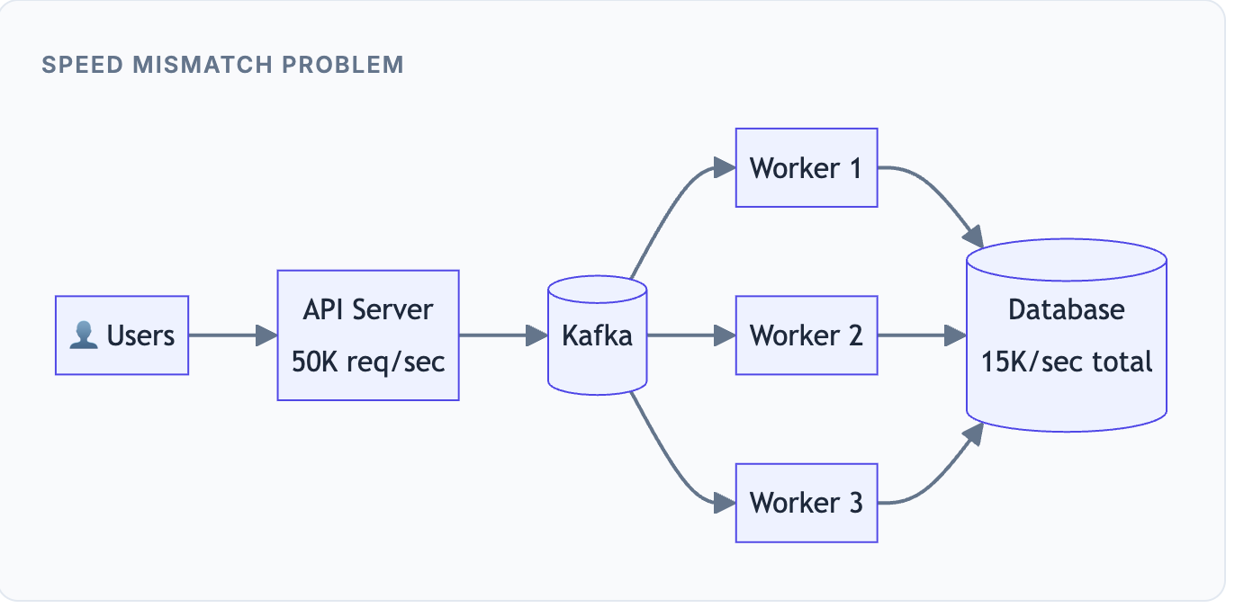 Think about it this way: Your API server can accept 50,000 requests per second because it's just receiving data. But your database can only write 5,000 records per second because it needs to persist data to disk, maintain indexes, and ensure consistency. When you directly connect the fast component to the slow component, the slow one becomes a bottleneck that drags everything down.