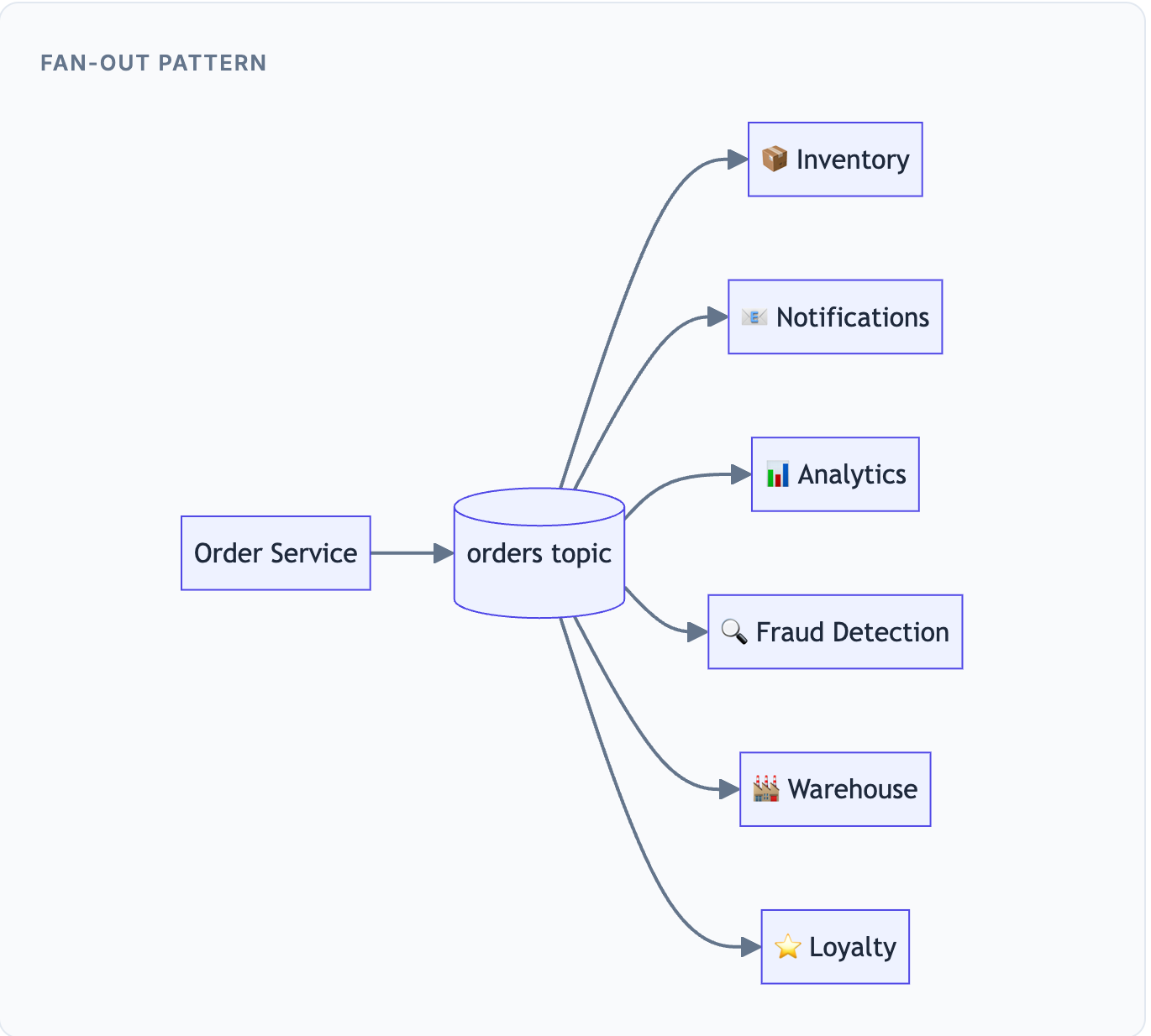 This is where Kafka’s pub/sub model truly shines - the ability to broadcast one event to many independent consumers without the producer knowing or caring about them.
