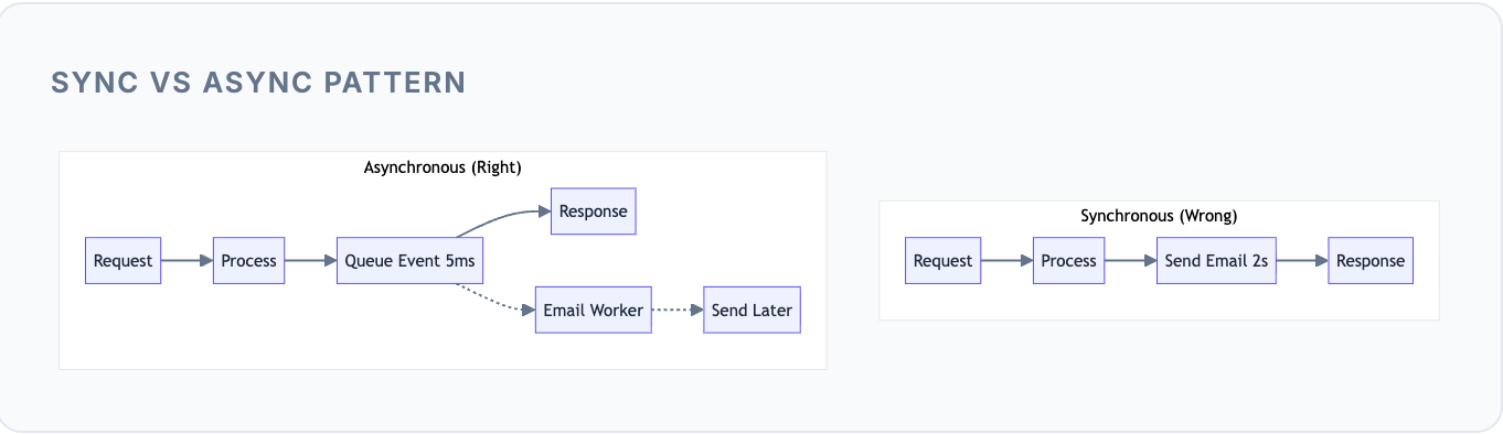 Why Sync is Wrong Here: Sending an email might take 1-3 seconds (DNS lookup, SMTP handshake, server response). That’s 1-3 seconds the user waits unnecessarily. Worse, if the email server is slow or down, the user’s signup fails - even though email delivery isn’t critical to completing signup.